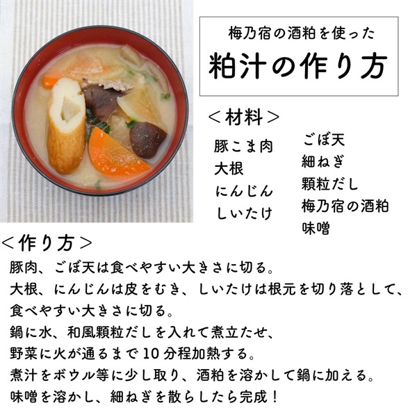 ※要冷蔵商品のため、配送サービスは「日本郵便(チルドゆうパック)」をお選びください。 梅乃宿のお酒をしぼった後の酒粕です。粕汁・焼き粕・甘酒・粕漬け等様々な食べ方や、酒粕パックといった利用方法もあります。 ※酒粕は熟成により色が茶色に変色したり軟化したりします。熟成を抑えたい方は冷蔵庫で保管し、お早めにお召し上がりください。 ※酒粕はアルコールを含んでいます。アルコールに弱い方、お子様はご注意ください。 ※新鮮な酒粕の為、袋の膨張防止に空気穴を開けております。