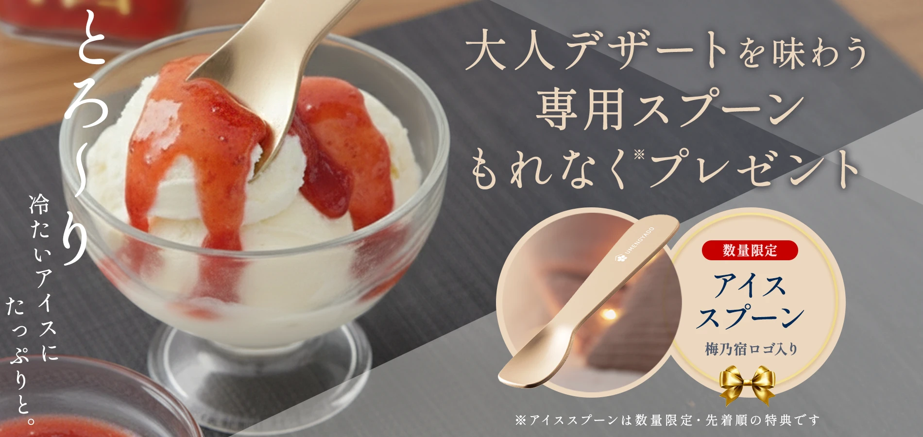梅乃宿酒造公式オンラインショップでは、大人の果肉の沼と相性のいい「オリジナルアイススプーン」をご用意し、とろ~り濃厚な時間を楽しんでもらえるキャンペーンを実施いたします。