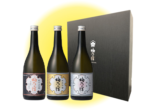 梅乃宿の日本酒「純米大吟醸 山田錦・純米吟醸・純米」をセットにした日本酒呑み比べセットです。 (「純米大吟醸 山田錦」「純米吟醸」「純米」 720ml×各1本)