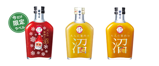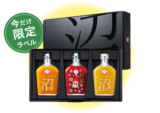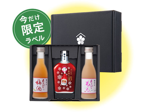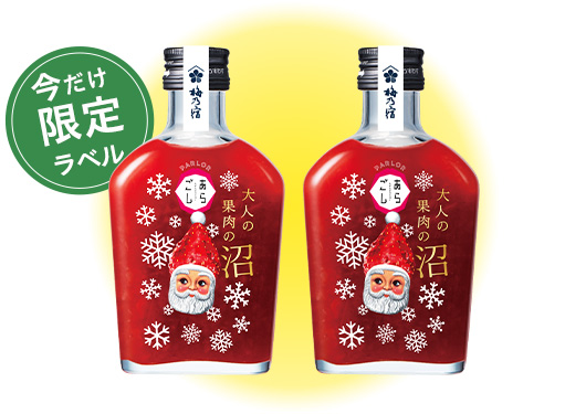 梅乃宿がつくる大人気果実リキュールと 大人の果肉の沼をお得に試せる限定セット。 (大人の果肉の沼「いちご」200ml×1本、あらごし梅酒 180ml×1本、あらごしもも 180ml×1本) ※クリスマス限定ラベルは数量限定商品となります。