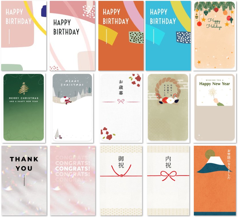 誕生日、お礼など、母の日、クリスマスなどシーンに合わせたデジタルメッセージカードをご用意しております。